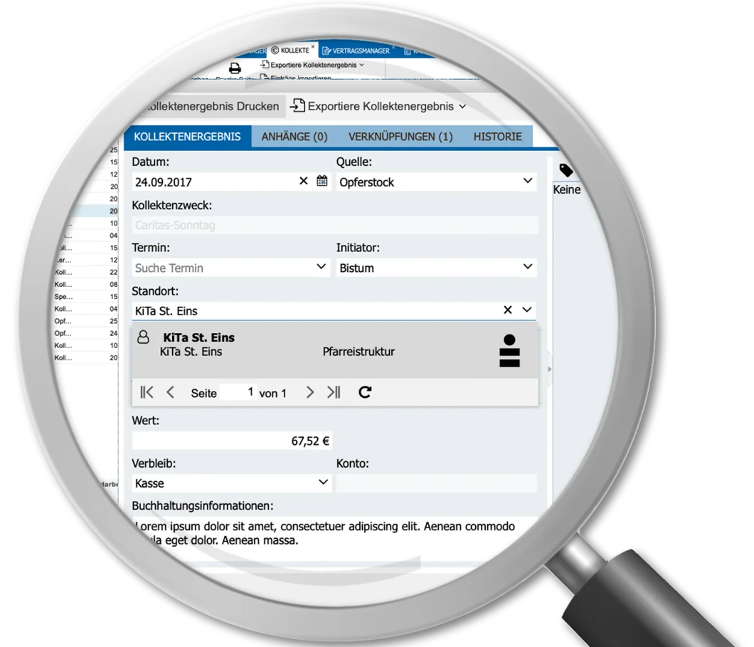 Im Kollektenmodul von ecclesias lassen sich zum einen Kollekten planen und zum anderen kann man das Kollektenergebnis verwalten. Für welchen Zweck wird gesammelt? Wer ist Initiator, wie hoch ist die Diözesan-Abgabe? Auch ein Zeitraum kann angegeben werden, in dem die Kollekte automatisch mit den geplanten Gottesdiensten verknüpft wird.